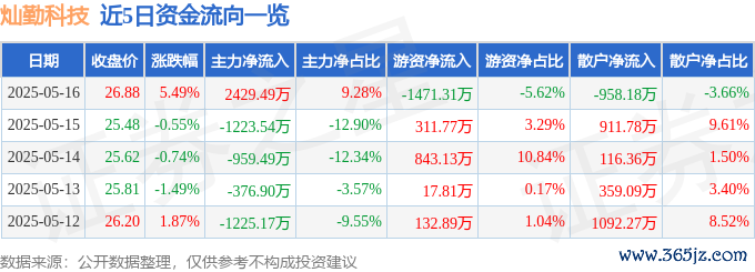 5月16日的资金流向数据方面,主力资金净流入2429.49万元,占总成交额9.28%,游资资金净流出1471.31万元,占总成交额5.62%,散户资金净流出958.18万元,占总成交额3.66%。