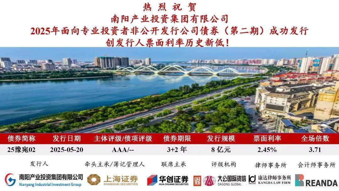 【大河财立方消息】5月20日,南阳产业投资集团成功发行2025年面向专业投资者非公开发行公司债券(第二期),发行规模8亿元,期限3+2年,全场认购倍数3.71倍,票面利率2.45%炒股10倍杠杆软件,创集团融资成本新低。